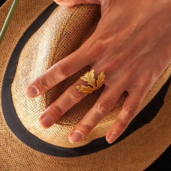 – Bague feuille d’érable dorée or fin, patinée