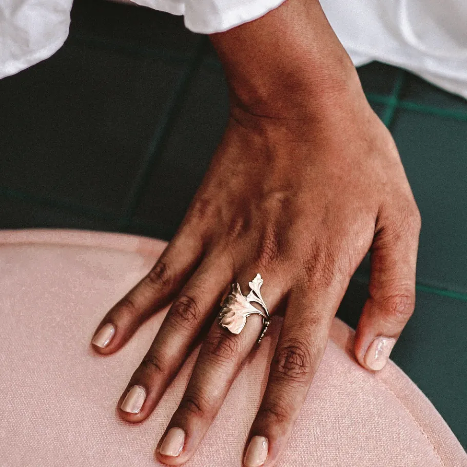 Bague Ginkgo Dorée- Bague dorée or fin, patinée- Bague ajustable- Sans Nickel- Livré avec une pochette tissée main