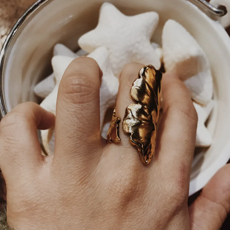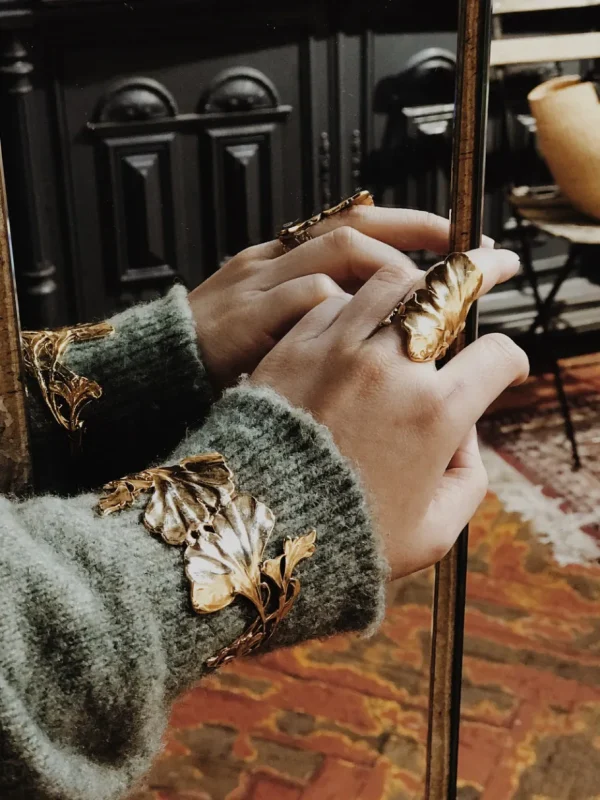– Bague feuille de Ginkgo dorée or fin, patinée