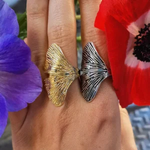 Bague Petite Feuille de Ginkgo Argentée – Bague en laiton argenté, patiné – Bague ajustable – Sans Nickel…