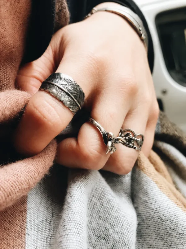 BAGUE PLUME- Bague argentée, patinée- Bague ajustable- Sans Nickel- Livré avec une pochette tissée main