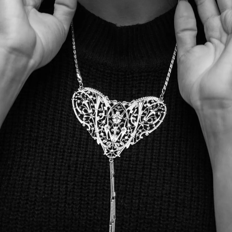 Collier Grand Cœur Filigrane- Collier argenté, patiné- Longueur: 40cm- Inoxydable- Sans Nickel- Livré avec une poche…