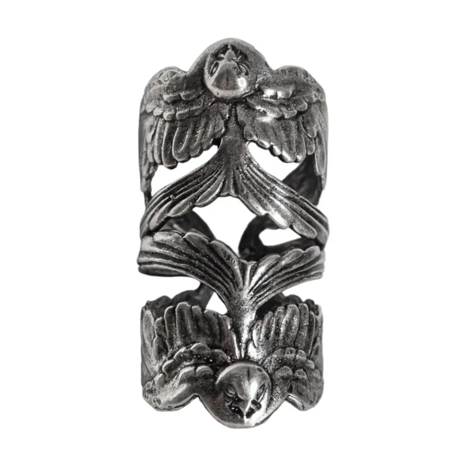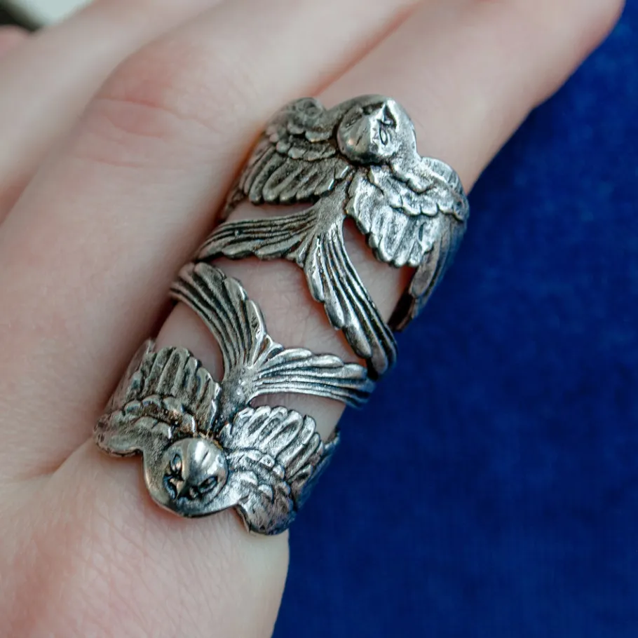 Bague Double Hirondelle- Bague argentée , patinée- Bague ajustable- Sans Nickel- Livré avec une pochette tissée main