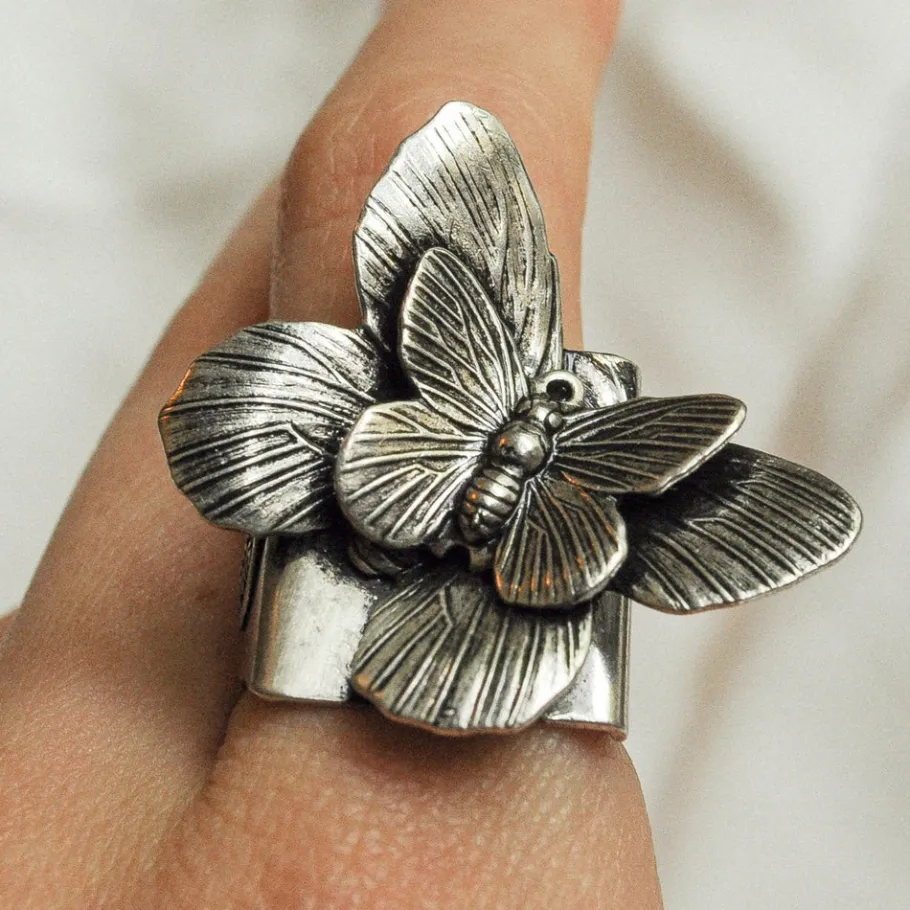 Bague Double Papillon- Bague en laiton argenté , patinée- Bague ajustable- Sans Nickel- Livré avec une pochette ti…
