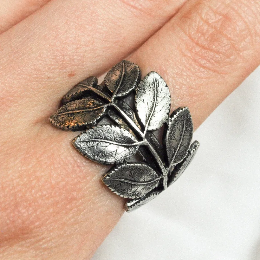 Bague Feuille d’Acacia- Bague en laiton argentée, patinée- Bague ajustable- Sans Nickel- Livré avec une pochette tiss…