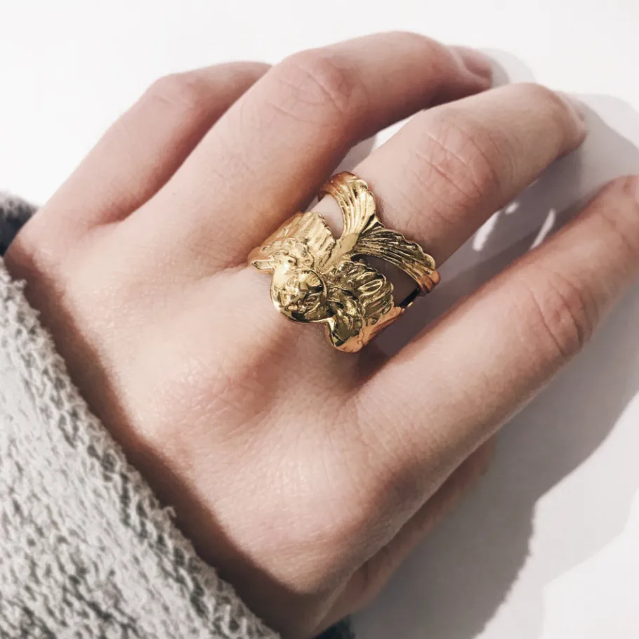 Bague Hirondelle Dorée- Bague dorée or fin, patinée- Bague ajustable- Sans Nickel- Livré avec une pochette tissée m…
