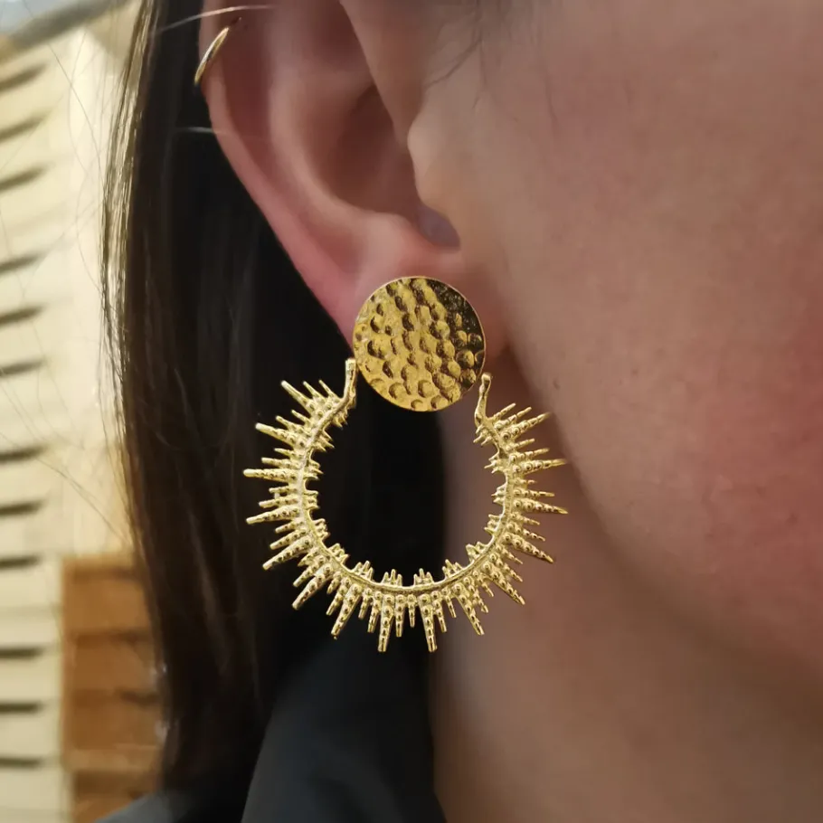 Découvrir notre nouvelle collection des boucles d’oreilles aux puces avec motif lune et rayons de soleil dorés.