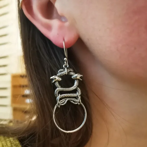 Découvrir nos nouvelles boucles d’oreilles crochets avec motif de deux serpents de notre collection inspirée d’anima…
